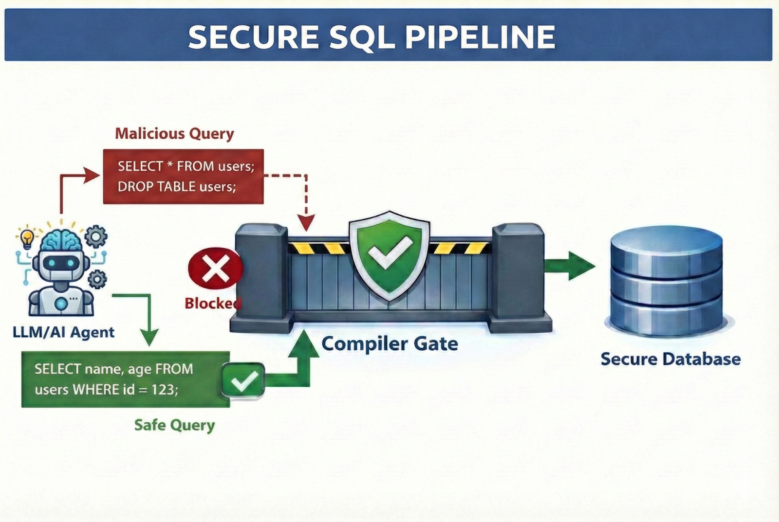 - Destructive Command Blocking: We traverse the tree to ensure no DROP, ALTER, or UPDATE nodes exist.